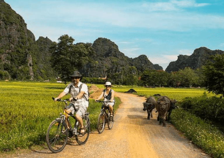 15h30: Sau khi kết thúc chuyến tham quan Tam Cốc, Quý khách tiếp tục tham gia hoạt động đạp xe qua những con đường làng quê yên bình, trải dài là cánh đồng lúa và làng mạc mộc mạc. Cung đường làng ở Ninh Bình với đường nhựa phẳng và không gian thoáng đãng là trải nghiệm lý thú để khám phá cuộc sống làng quê Việt Nam truyền thống.